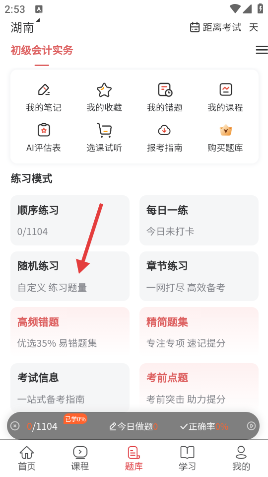 1、在题库页面,点击【随机练习】选项,进入设置每组题数量的界面。