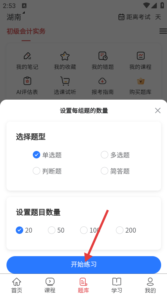 2、在设置界面,选择题型和题目数量,点击【开始练习】。