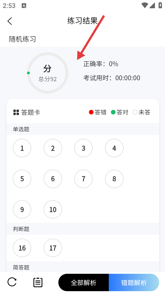 4、练习完成后,进入练习结果页面,查看正确率、考试用时、答题卡等信息,也可查看全部解析或错题解析。