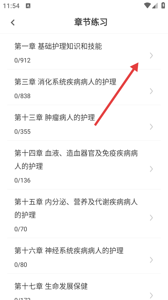 3、在章节列表中,选择章节,如【第一章基础护理知识和技能】。