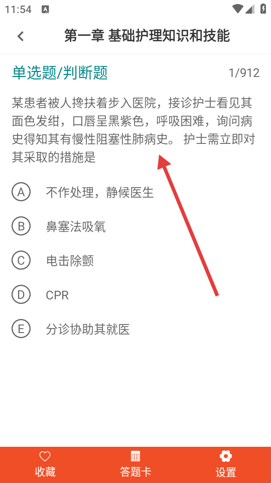 4、进入章节题目后,可查看题目并选择答案,还能使用收藏、答题卡、设置等功能辅助学习。