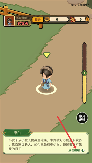1、在游戏开场旁白界面,点击“点击继续”按钮,跳过剧情介绍,进入游戏主操作界面。