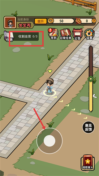 2、进入主界面后,找到标注的韭菜区域,点击该区域完成“收割韭菜0/3”的任务,推进任务进度。