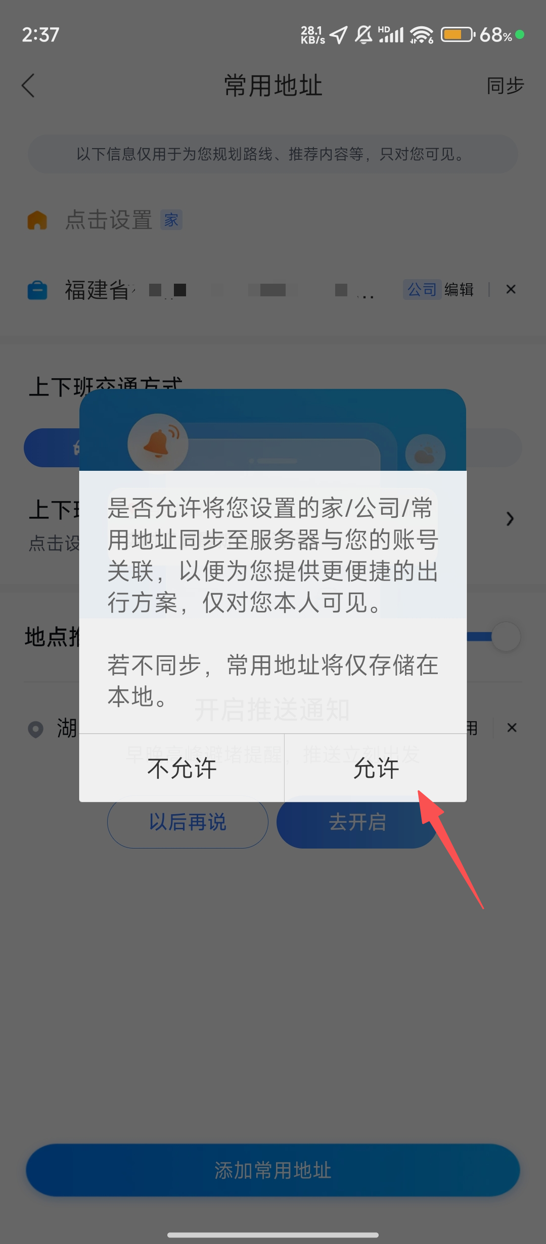 4、设置好公司地址后,若出现同步提示框,点击【允许】,公司地址就设置完成啦。
