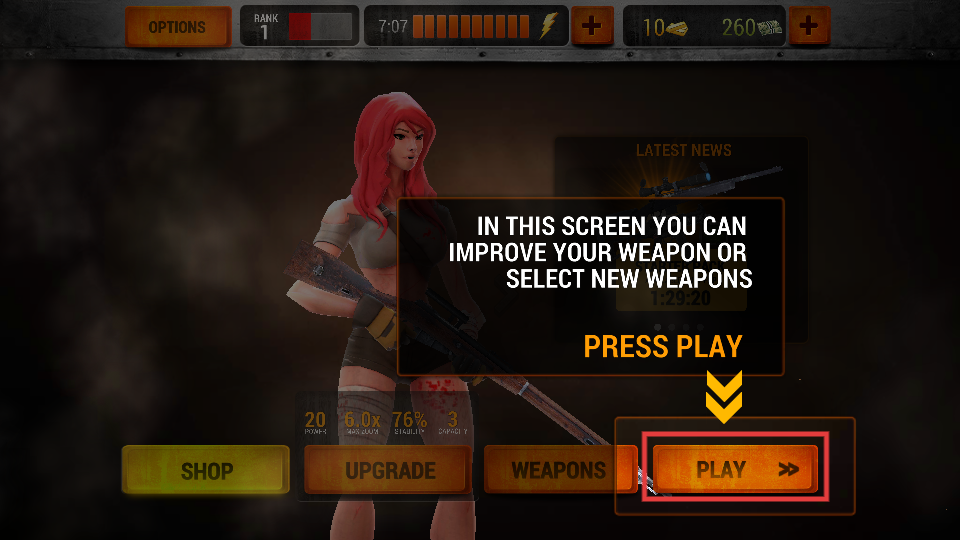 1、在该界面可升级武器或选新武器,点击【PLAY】按钮即可进入游戏,开启僵尸射击挑战。