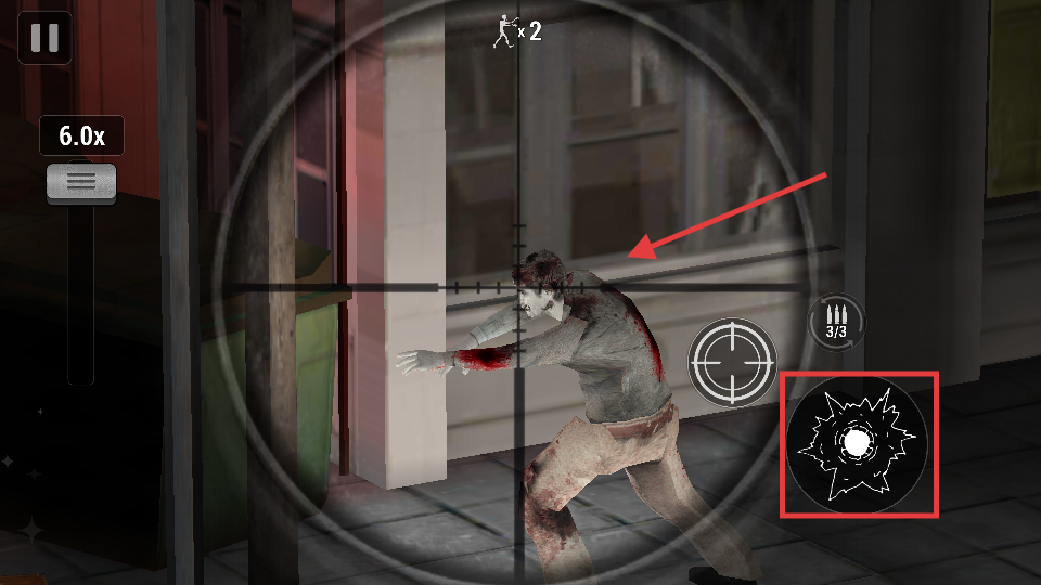 2、瞄准僵尸要害,点击开火按钮射击,子弹数为【3/3】时优先攻击威胁大的僵尸,确保精准击杀。