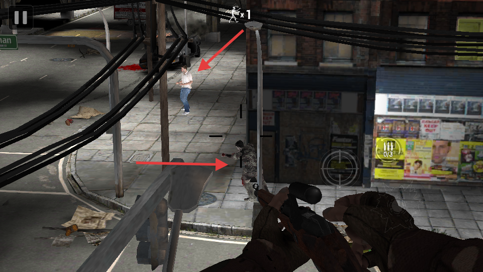 1、下载安装后点右下角play开始,进入后点击瞄准,通过左边调倍镜倍数,注意不误杀幸存者。