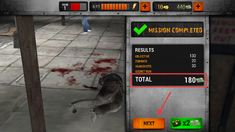 4、任务完成后,【TOTAL】得【180】金币,点击【NEXT】按钮进入下一关,金币可用于武器升级或解锁。