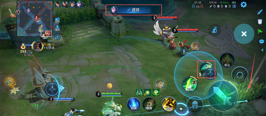 1、队友发送【进攻】信号时,可借助二技能位移飞入草丛,快速接近敌方英雄呢。