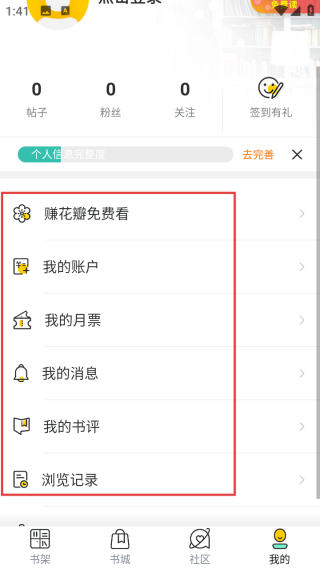 3、在【我的】页面,使用赚花瓣免费看书、查看账户、月票、消息、书评及浏览记录。