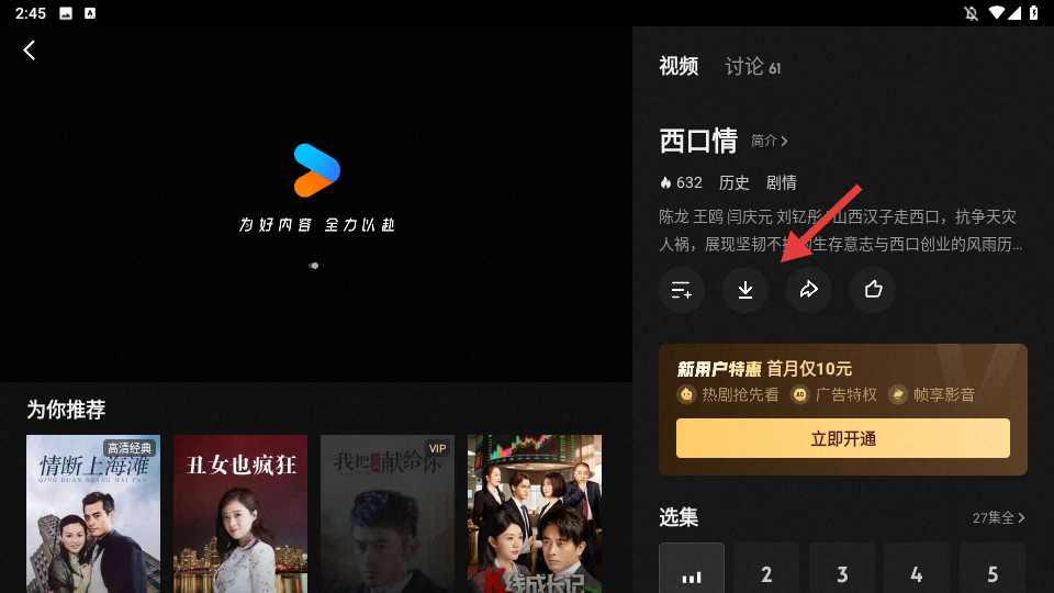 2、在播放页面右侧,点击下载图标,弹出选集界面。