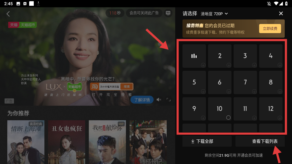 3、在选集界面,选择要下载的集数,再点击【查看下载列表】。