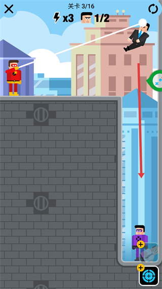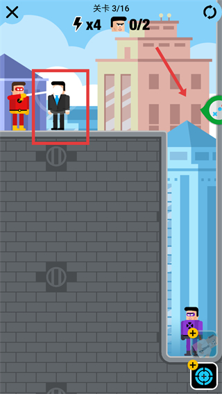 2、处于【关卡3】,目标击败【2】个敌人,长按屏幕控制红框内的西装敌人,将其拖动至箭头处。