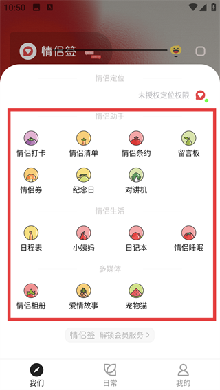1、在【我们】界面,可使用【情侣打卡】、【情侣清单】等功能,开启甜蜜情侣生活呢。