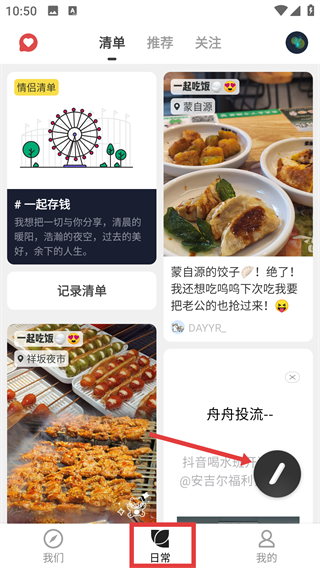 2、点击底部【日常】,进入情侣清单板块,能记录【一起存钱】等计划,还可分享日常哦。