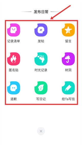 3、在【发布日常】中,选择【发帖】功能,可记录你们的专属故事,还有留言、时光记录等功能可选呀。