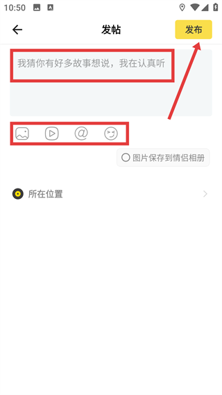 4、进入【发帖】界面,输入想分享的内容,最后点击【发布】,就能分享你们的甜蜜日常啦。