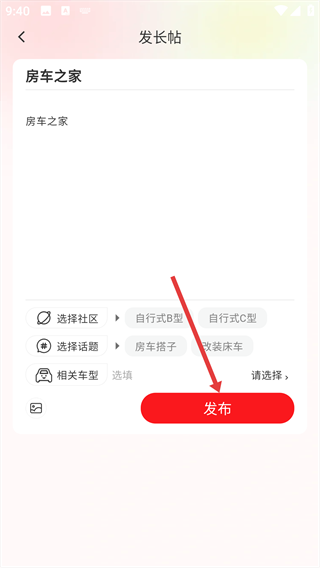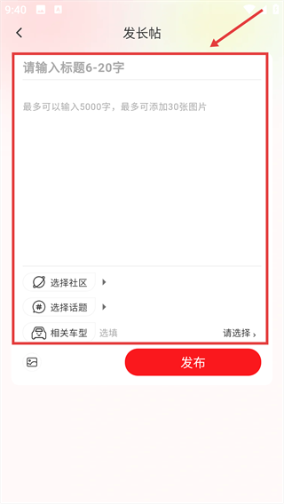 3、填写标题和编辑内容,并选择对应的社区、话题及相关车型。