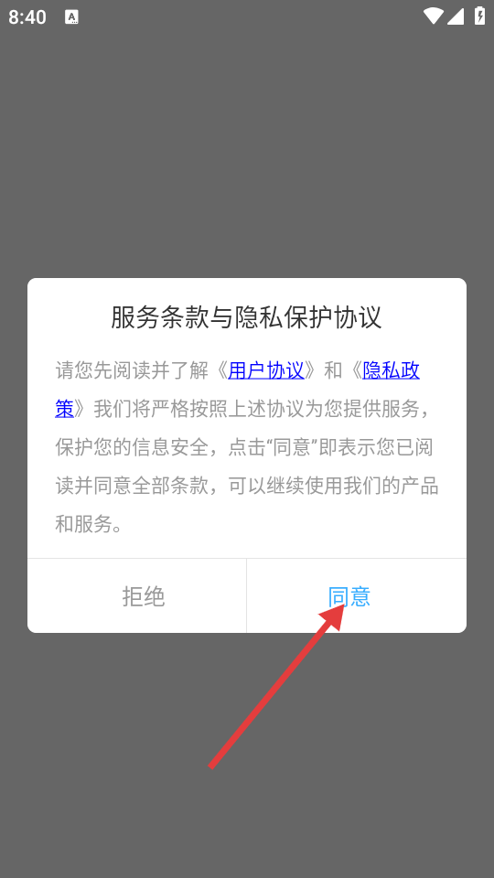 1、打开APP,在弹出的“服务条款与隐私保护协议”弹窗中,点击【同意】按钮。