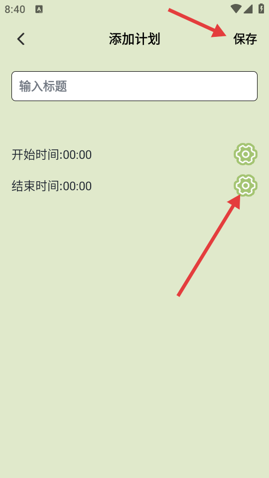 4、在添加计划页面,输入计划标题,设置开始时间和结束时间等信息后,点击右上角【保存】按钮,即可成功添加减肥计划。