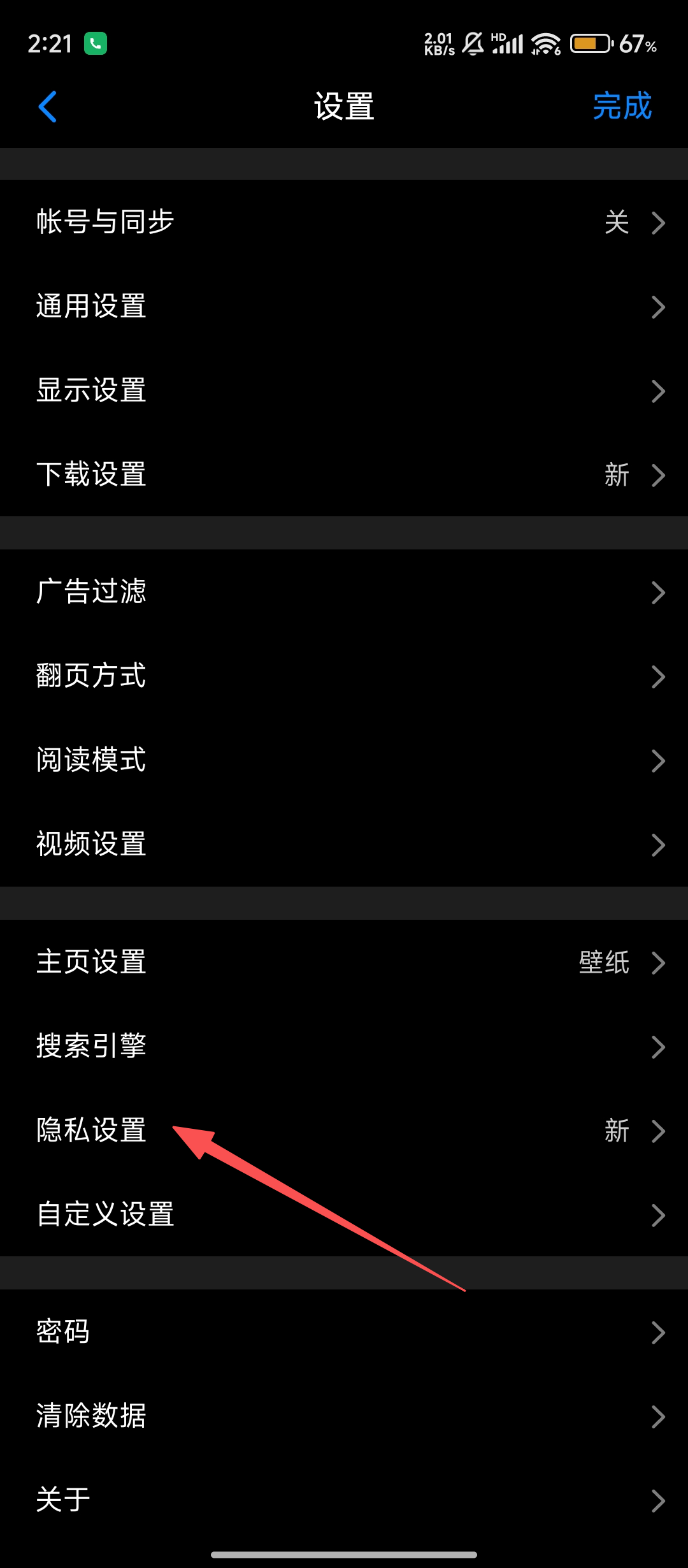 3、在【设置】页面中,点击【隐私设置】选项,进入隐私设置界面,为开启无痕模式做好准备啦。