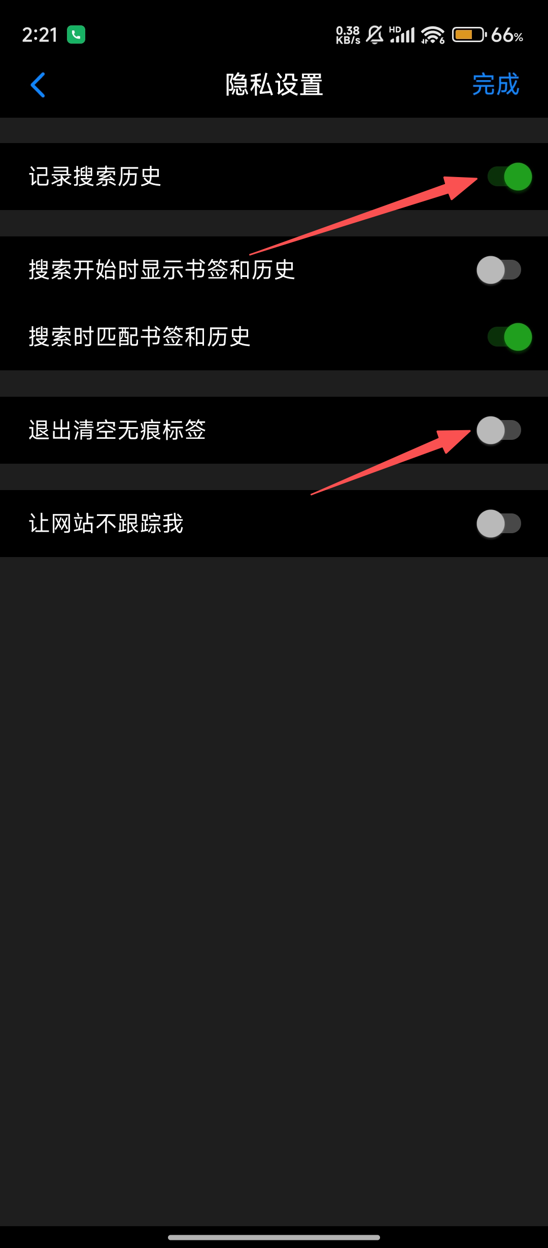 4、在【隐私设置】里,找到【退出清空无痕标签】开关并开启,即可实现浏览器退出时清空无痕标签哟。