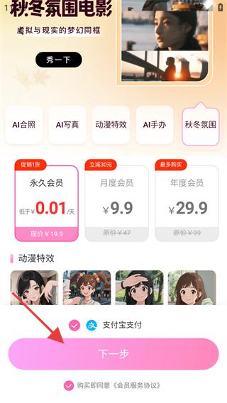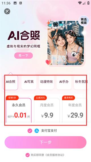 3、在套餐页选择目标会员类型(如永久会员、月度会员),选定支付方式(微信/支付宝)。