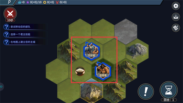 2、回合1界面中,可选择“守护者”势力与“勇者”单位,搭配资源地块(如粮食),构建初始势力的资源与战力基础。
