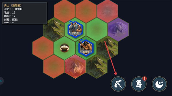 3、点击下方工具按钮(如镐子),可对地块进行开发操作,同时查看“勇者”属性(兵力100、攻击力12),规划单位部署。