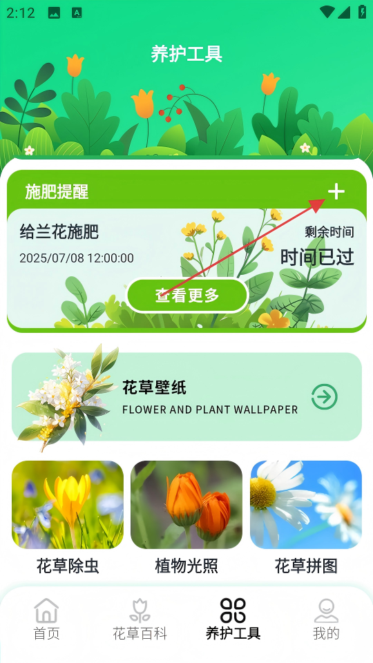 2、在【养护工具】页面,点击施肥提醒旁的“+”。