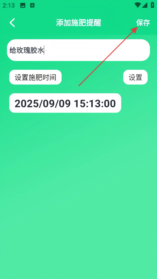 3、进入添加施肥提醒页面,输入提醒内容,设置施肥时间,点击【保存】。