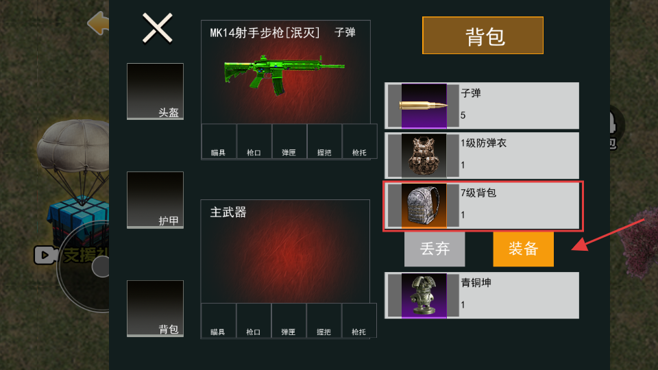 3、在装备界面选中【7级背包】道具后,点击【装备】按钮即可有效提升背包容量方便携带更多战斗物资。