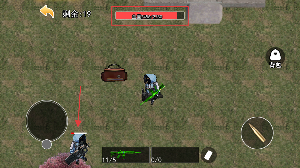 4、进入战斗场景后,需时刻注意【血量2456/2750】状态,使用武器击败敌人同时收集更多物资继续探险。
