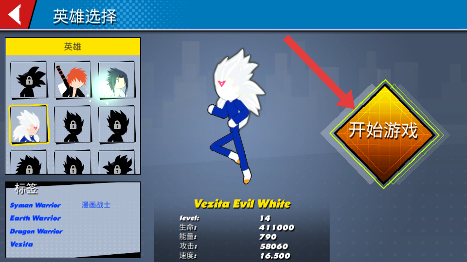 1、在英雄选择界面挑选Vezita-Evil-White英雄,点击【开始游戏】按钮进入战斗。
