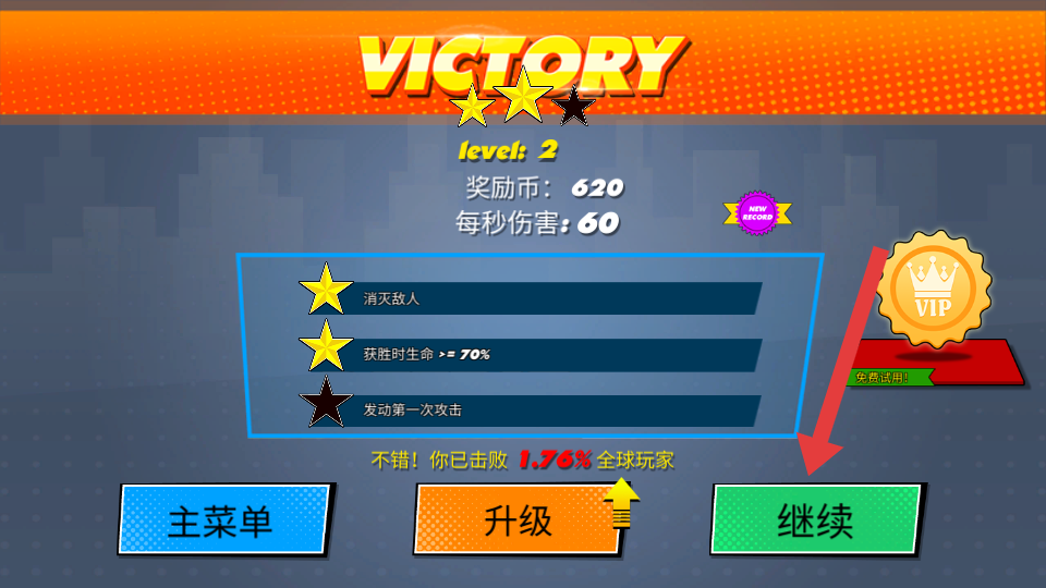 4、战斗胜利后点击【继续】按钮,领取【620】奖励币,继续挑战更高关卡。