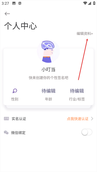 2、进入个人中心后,点击右上角的“编辑资料”选项。
