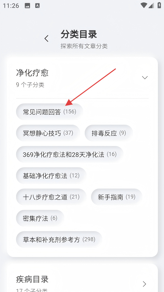 2、进入分类目录页面,在“净化疗愈”下选择【常见问题回答】。