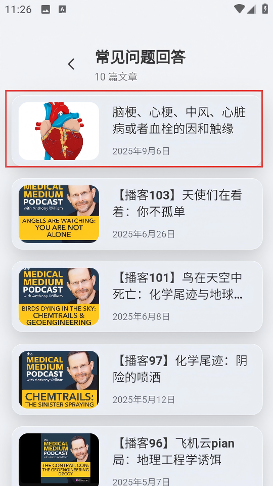 3、进入常见问题回答页面,选择“脑梗、心梗、中风、心脏病或者血栓的因和触缘”文章。