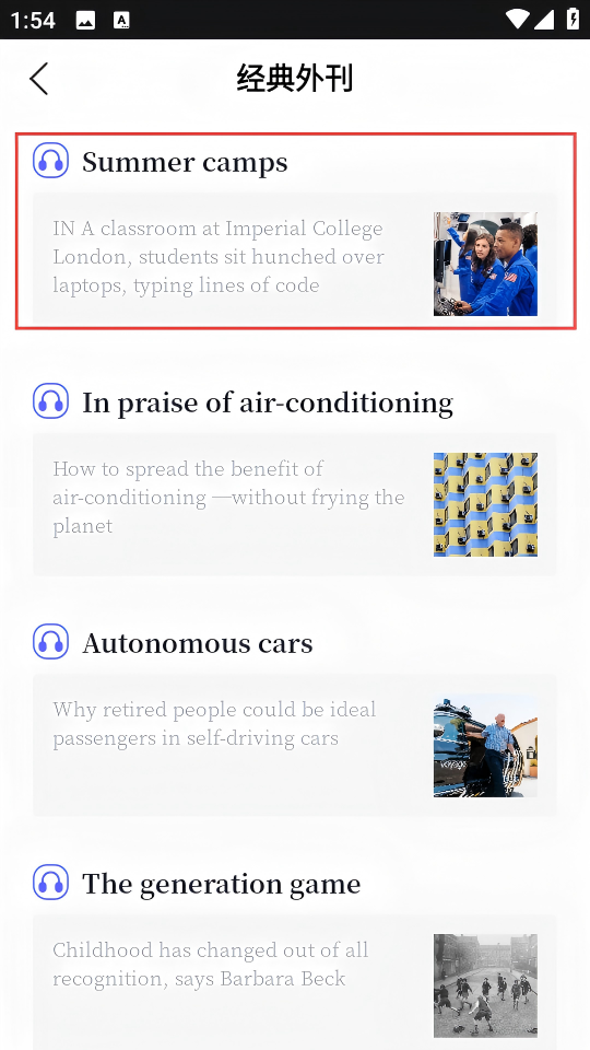 3、进入经典外刊页面,选择要学习的文章,如“Summer-camps”。