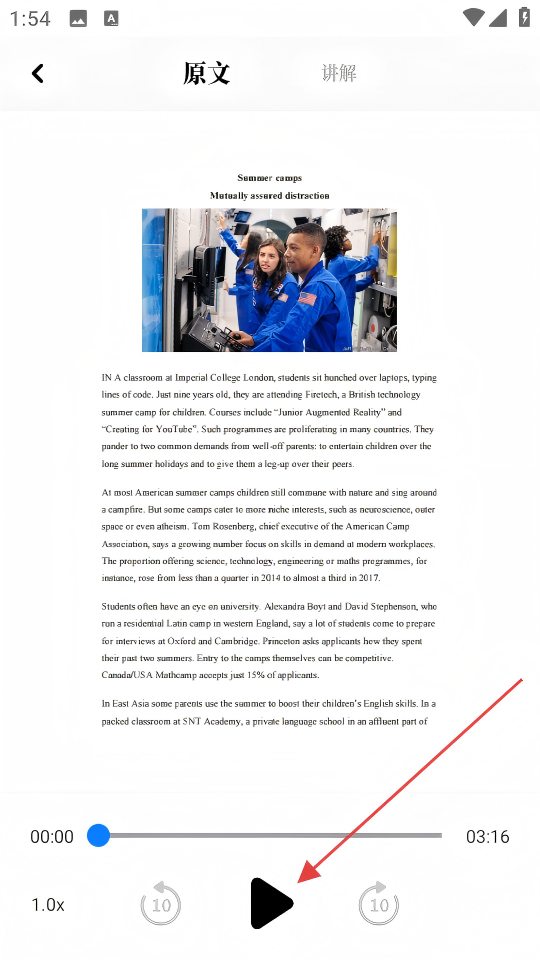 4、进入文章页面,可进行原文阅读,点击播放按钮还能收听音频。