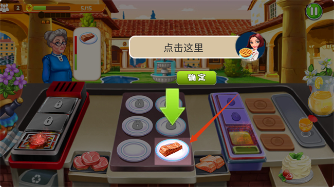 4、烹饪完成后,按照提示将菜品放置到对应餐盘,点击确定完成出餐,提升顾客满意度以获取更高分数。