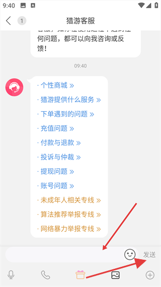 3、进入客服聊天页面,在输入框填写咨询内容后,点击【发送】按钮提交问题。