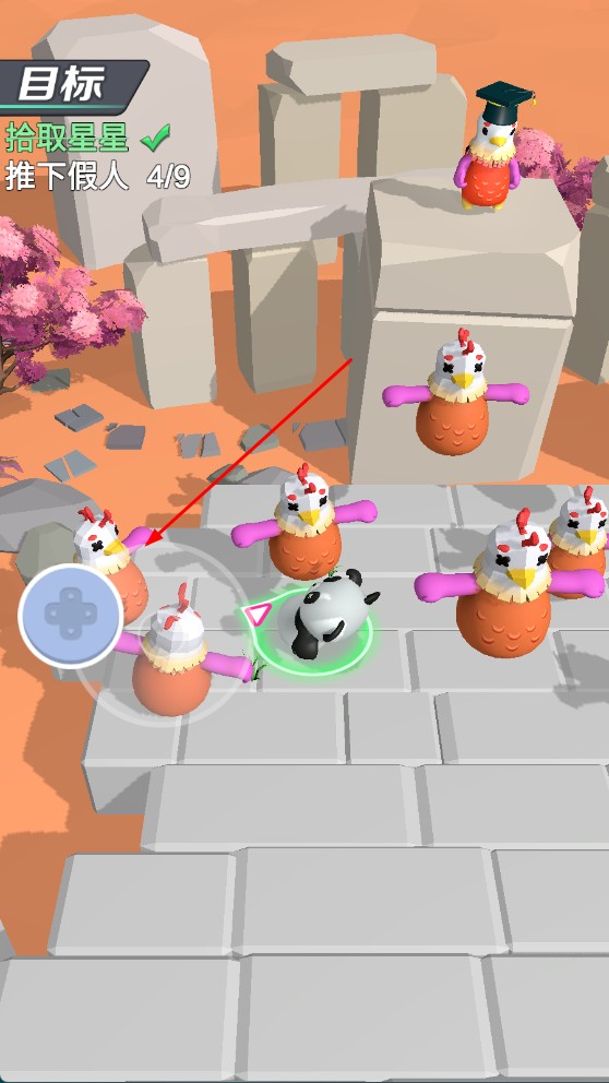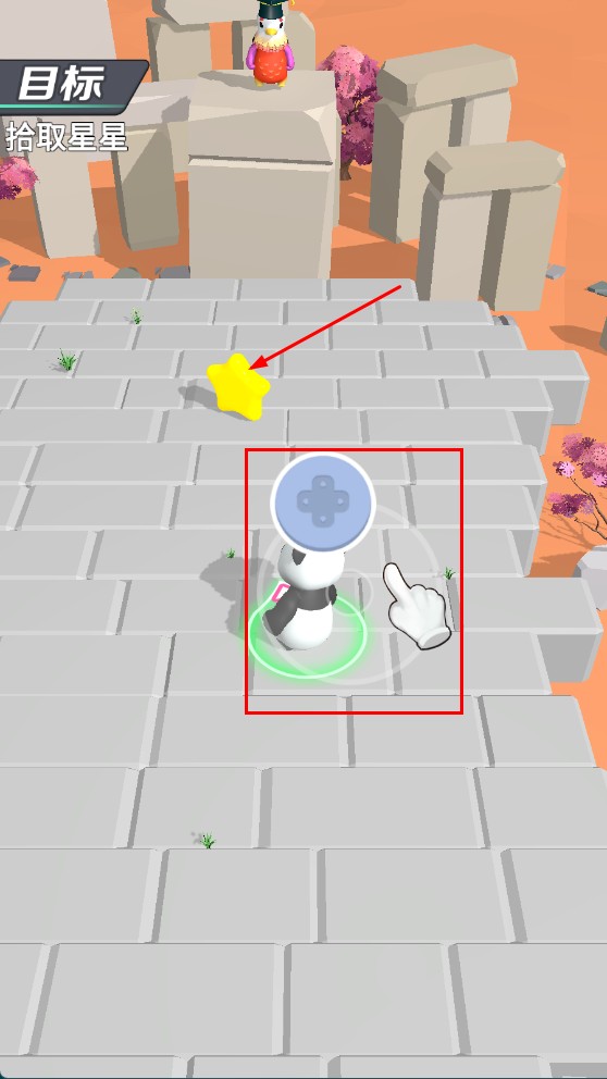1、通过虚拟摇杆操控熊猫角色移动,先拾取场景内的星星,完成“拾取星星”目标。