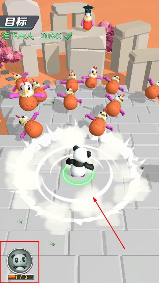 4、在面对大量木人时,可使用熊猫的技能,释放技能将木人推下,高效完成“推下木人”目标。