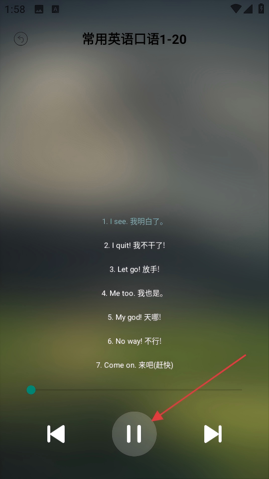 4、点击句子,进入点读页面,可进行英语句子的点读学习,点击暂停按钮可暂停点读。