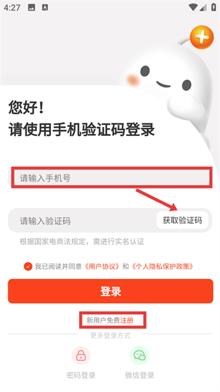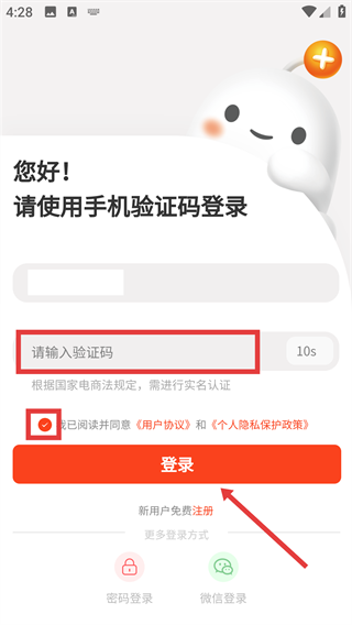 4、输入验证码,勾选【用户协议】和【个人隐私保护政策】,点击【登录】即可完成注册啦。