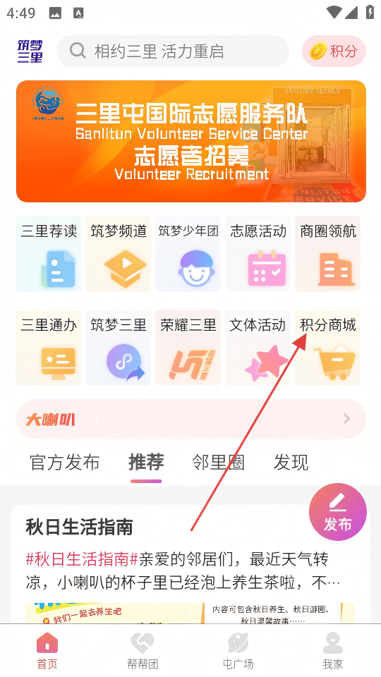 1、在软件首页,找到【积分商城】入口并点击,进入积分商城页面。