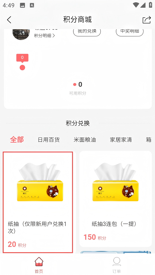 2、在积分商城页面,查看可用积分,选择想要兑换的商品。