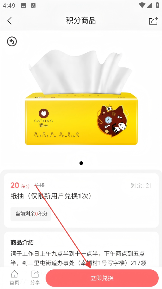 3、进入商品详情页,确认商品信息后,点击【立即兑换】按钮。