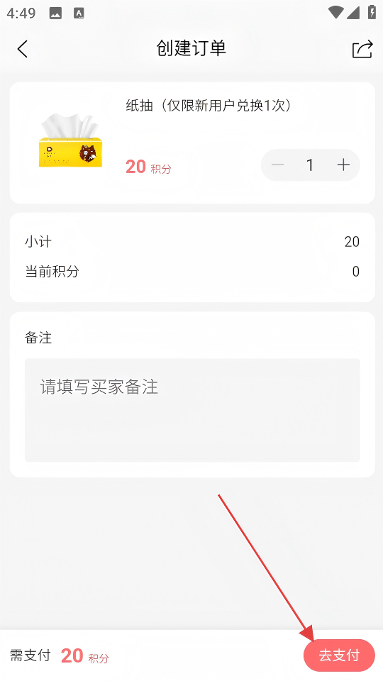 4、在创建订单页面,核对商品、积分等信息,点击【去支付】完成兑换。